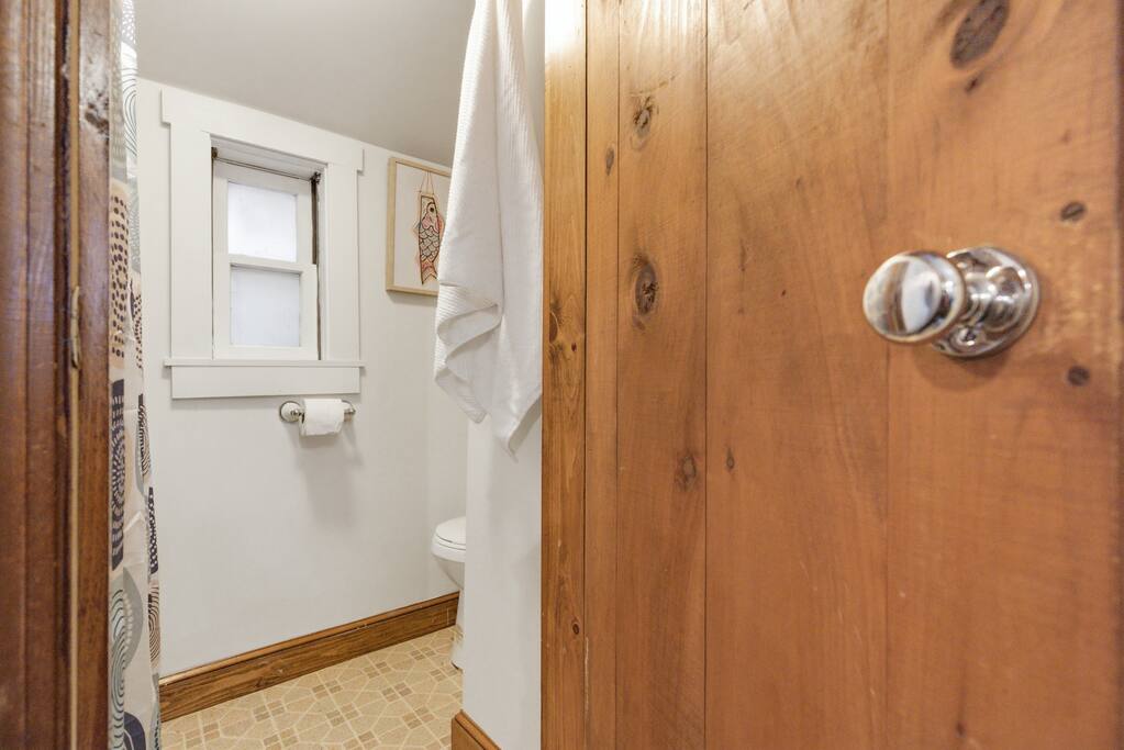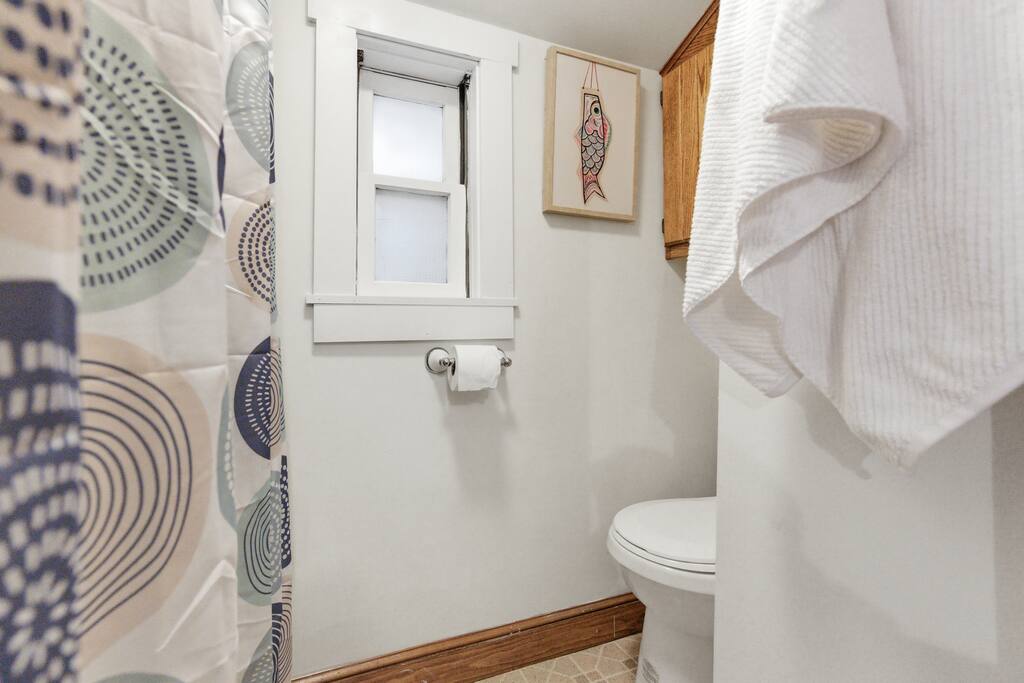 Small living room with open kitchen and breakfast bar. 1 bath with a tub/shower and no sink. The sink is in the kitchen just outside the bathroom. On the second floor is a small bedroom with queen bed. Lovely front screened porch. Bunk house with twin beds. Gas grill. Lots of stairs to climb. Not suitable for all guests.