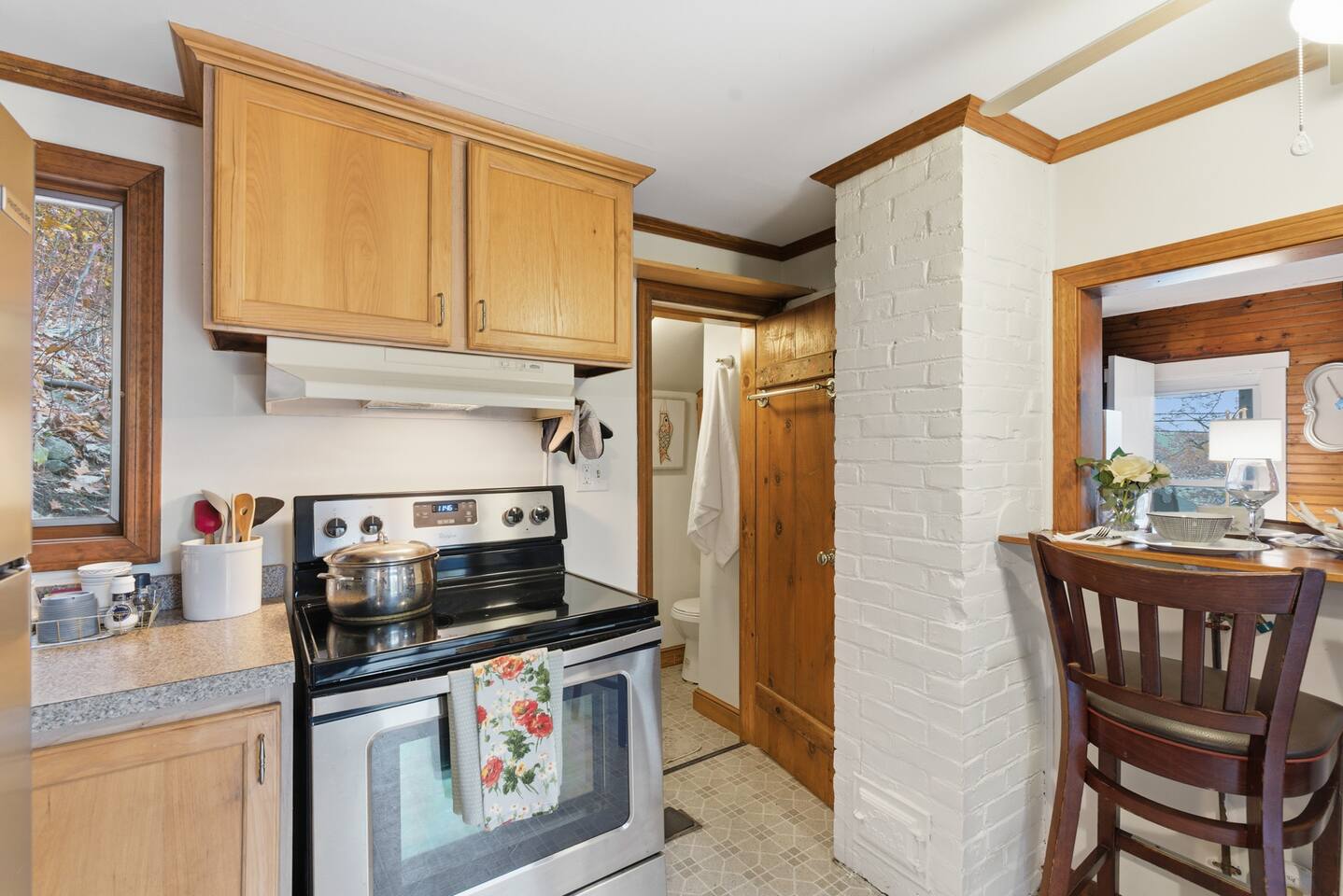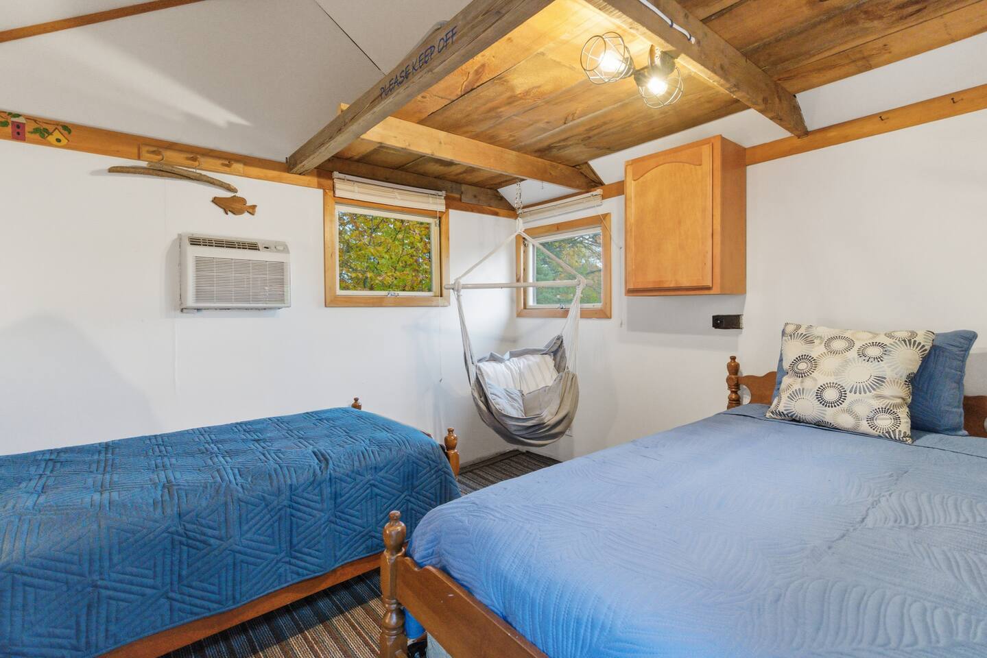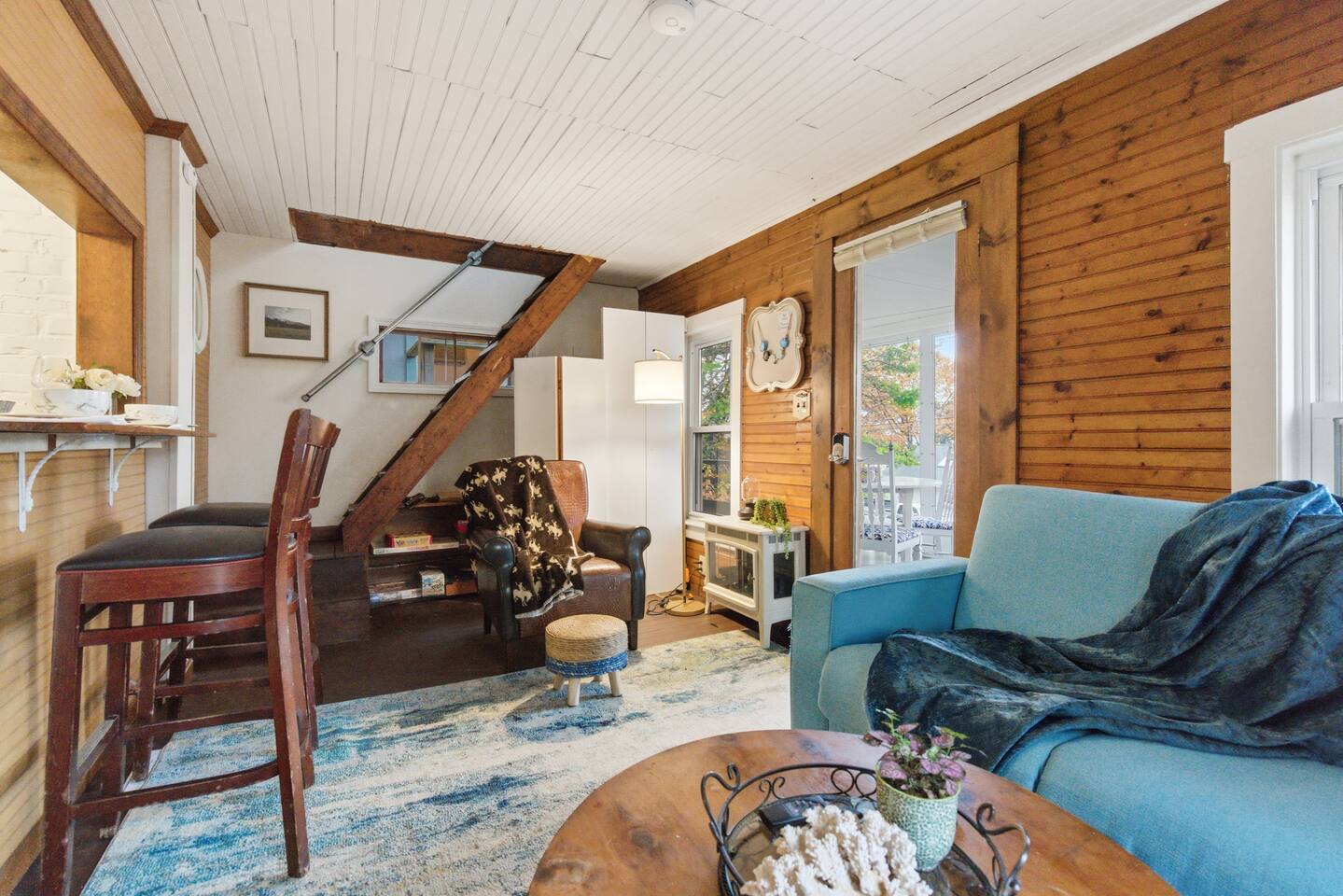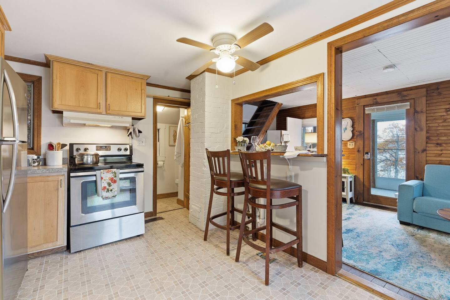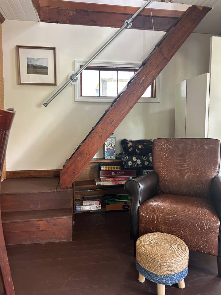 Small living room with open kitchen and breakfast bar. 1 bath with a tub/shower and no sink. The sink is in the kitchen just outside the bathroom. On the second floor is a small bedroom with queen bed. Lovely front screened porch. Bunk house with twin beds. Gas grill. Lots of stairs to climb. Not suitable for all guests.