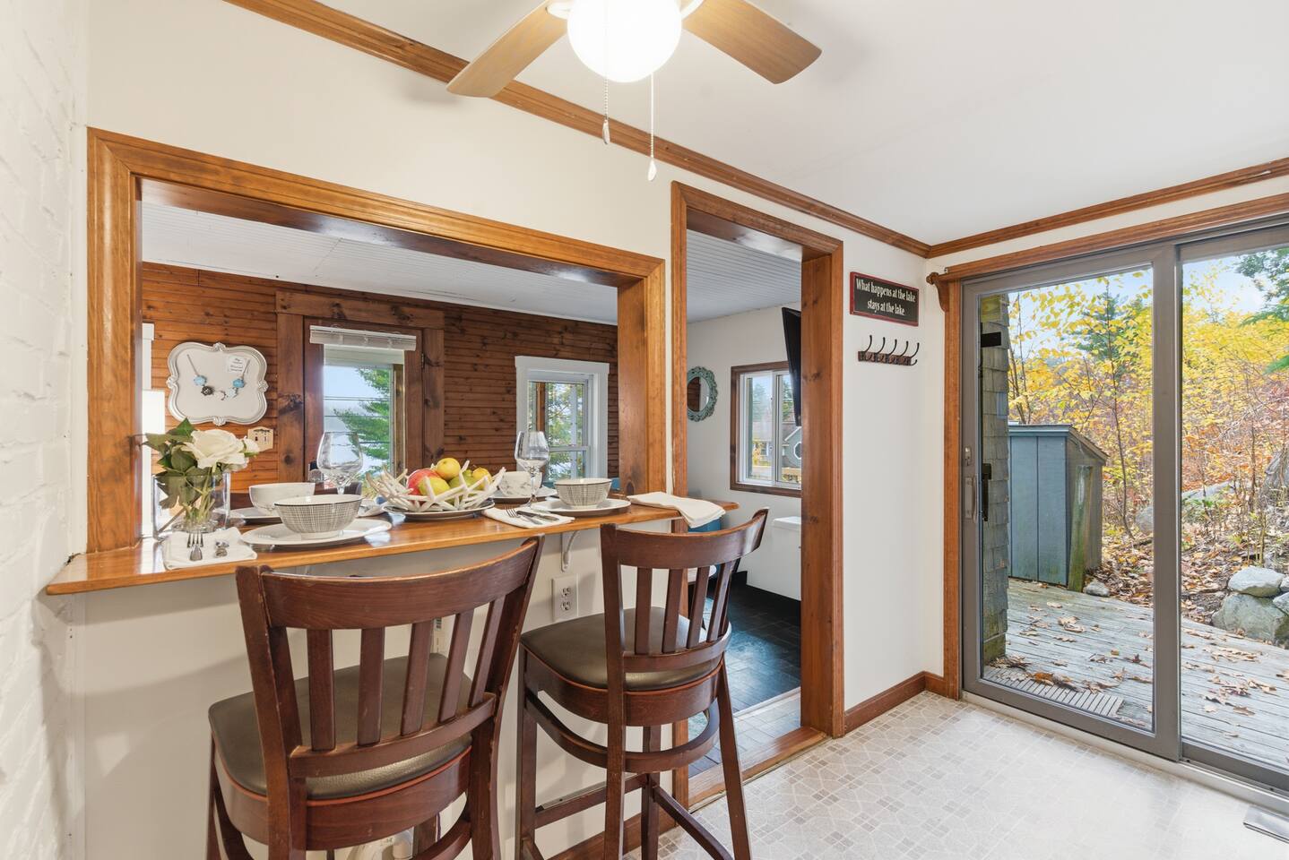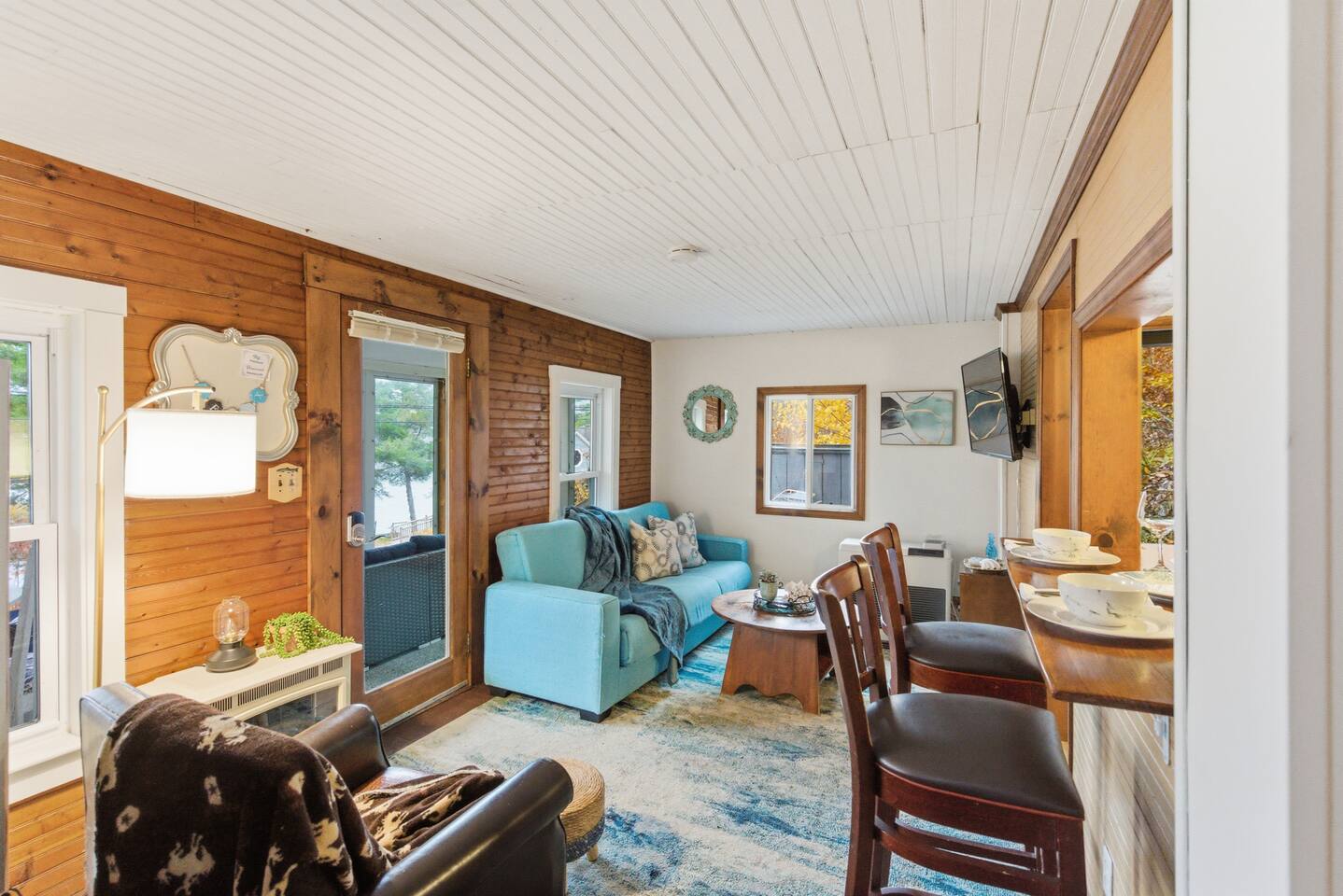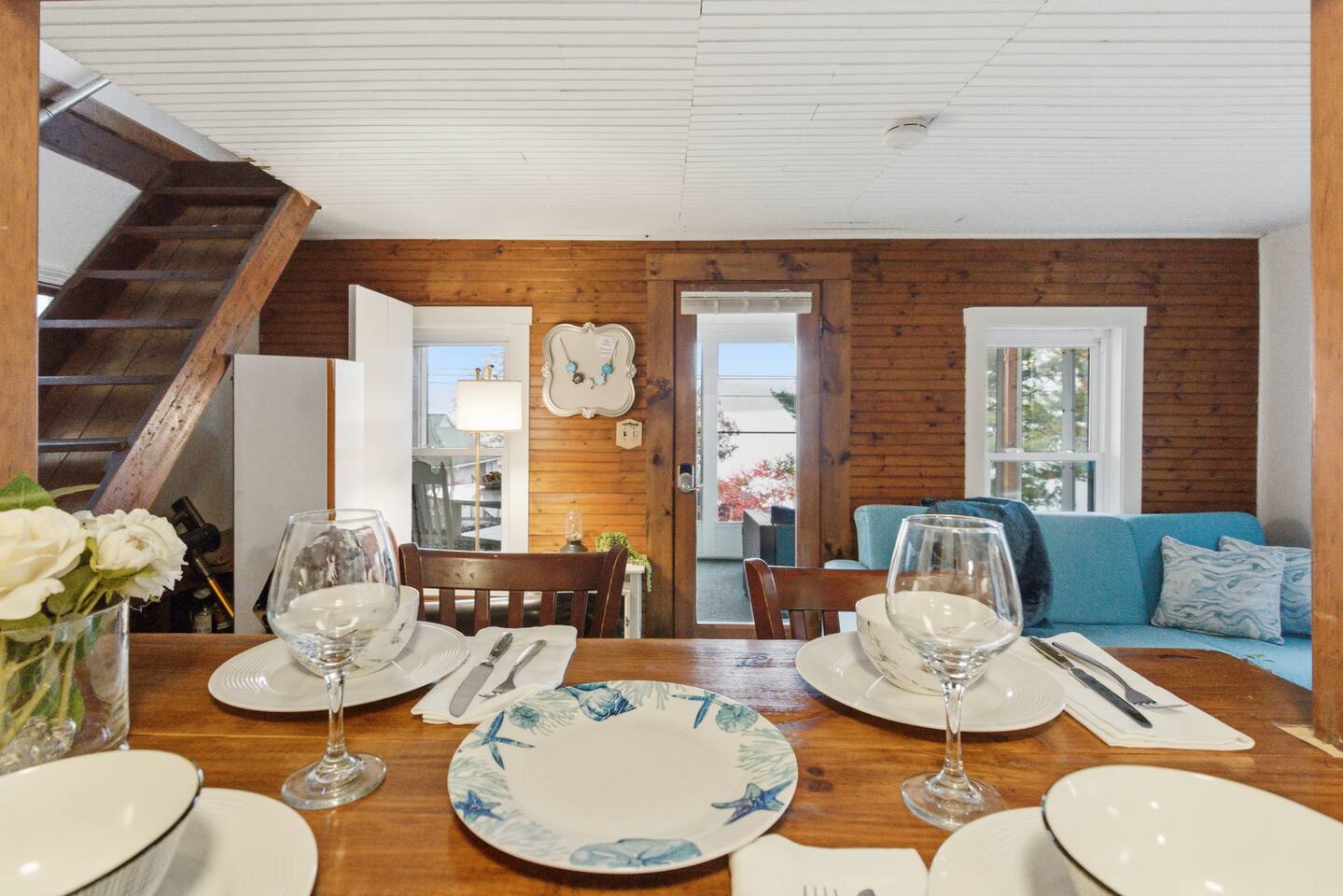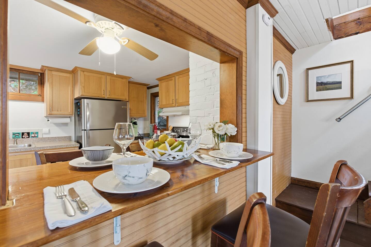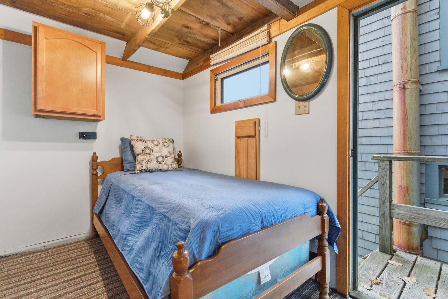 Small living room with open kitchen and breakfast bar. 1 bath with a tub/shower and no sink. The sink is in the kitchen just outside the bathroom. On the second floor is a small bedroom with queen bed. Lovely front screened porch. Bunk house with twin beds. Gas grill. Lots of stairs to climb. Not suitable for all guests.