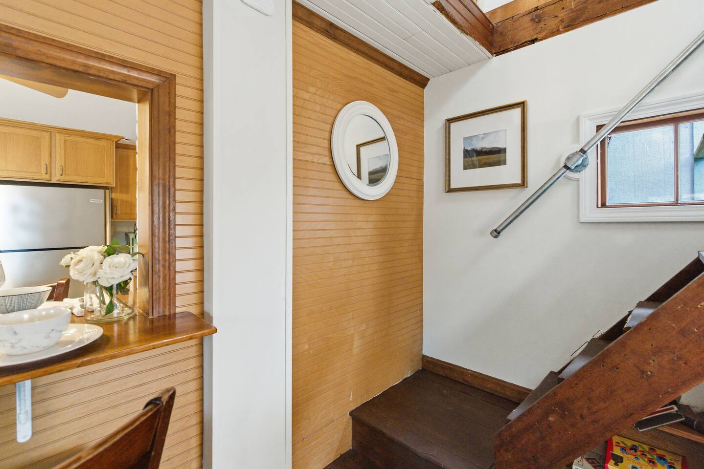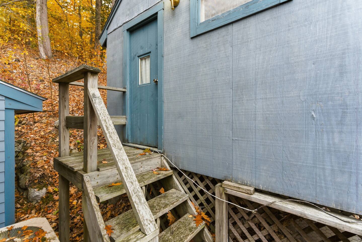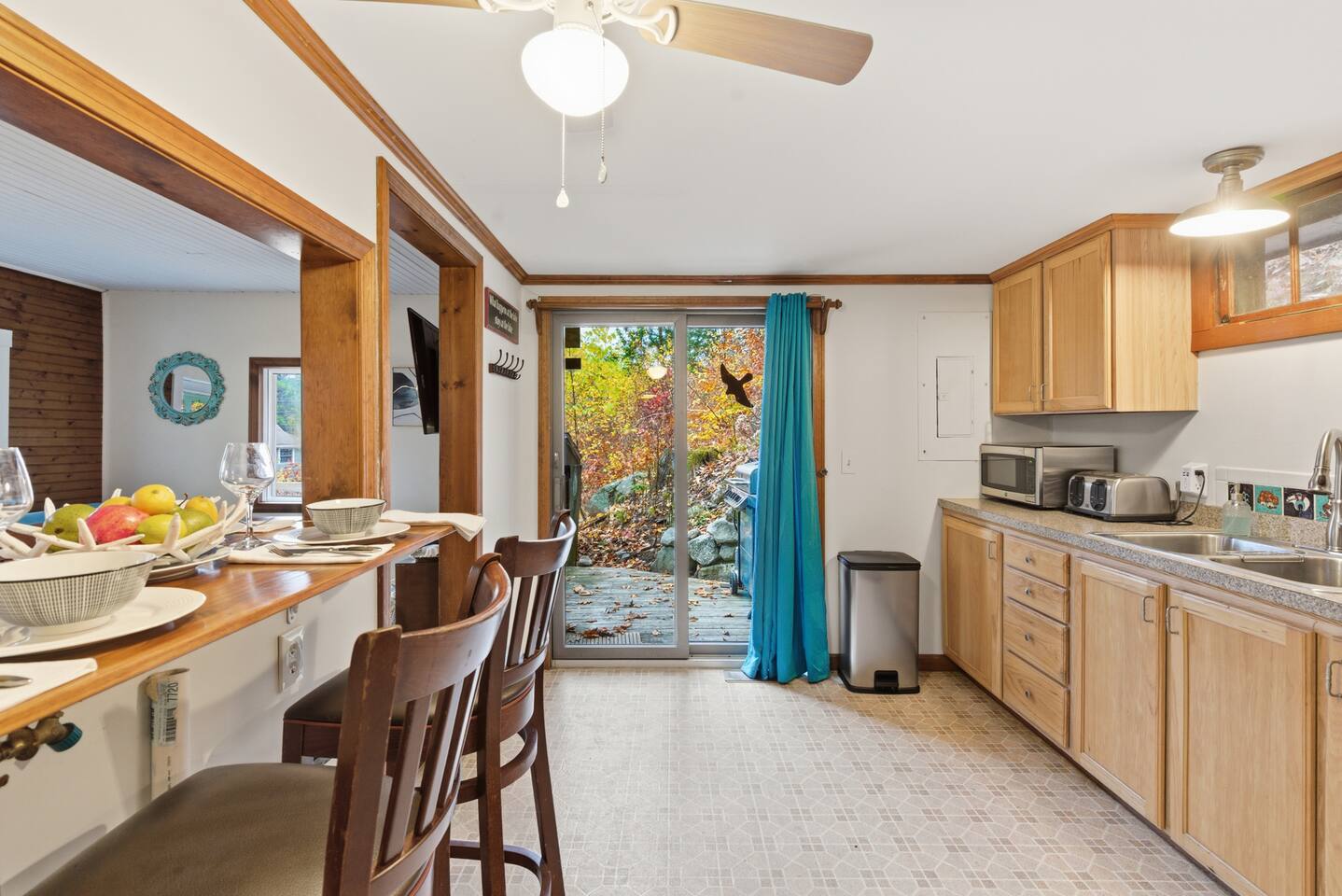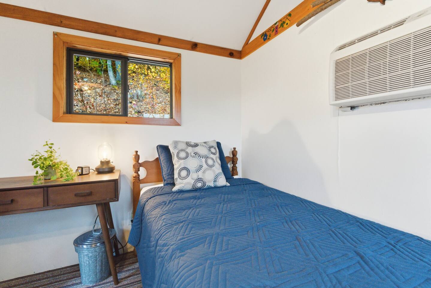 Small living room with open kitchen and breakfast bar. 1 bath with a tub/shower and no sink. The sink is in the kitchen just outside the bathroom. On the second floor is a small bedroom with queen bed. Lovely front screened porch. Bunk house with twin beds. Gas grill. Lots of stairs to climb. Not suitable for all guests.
