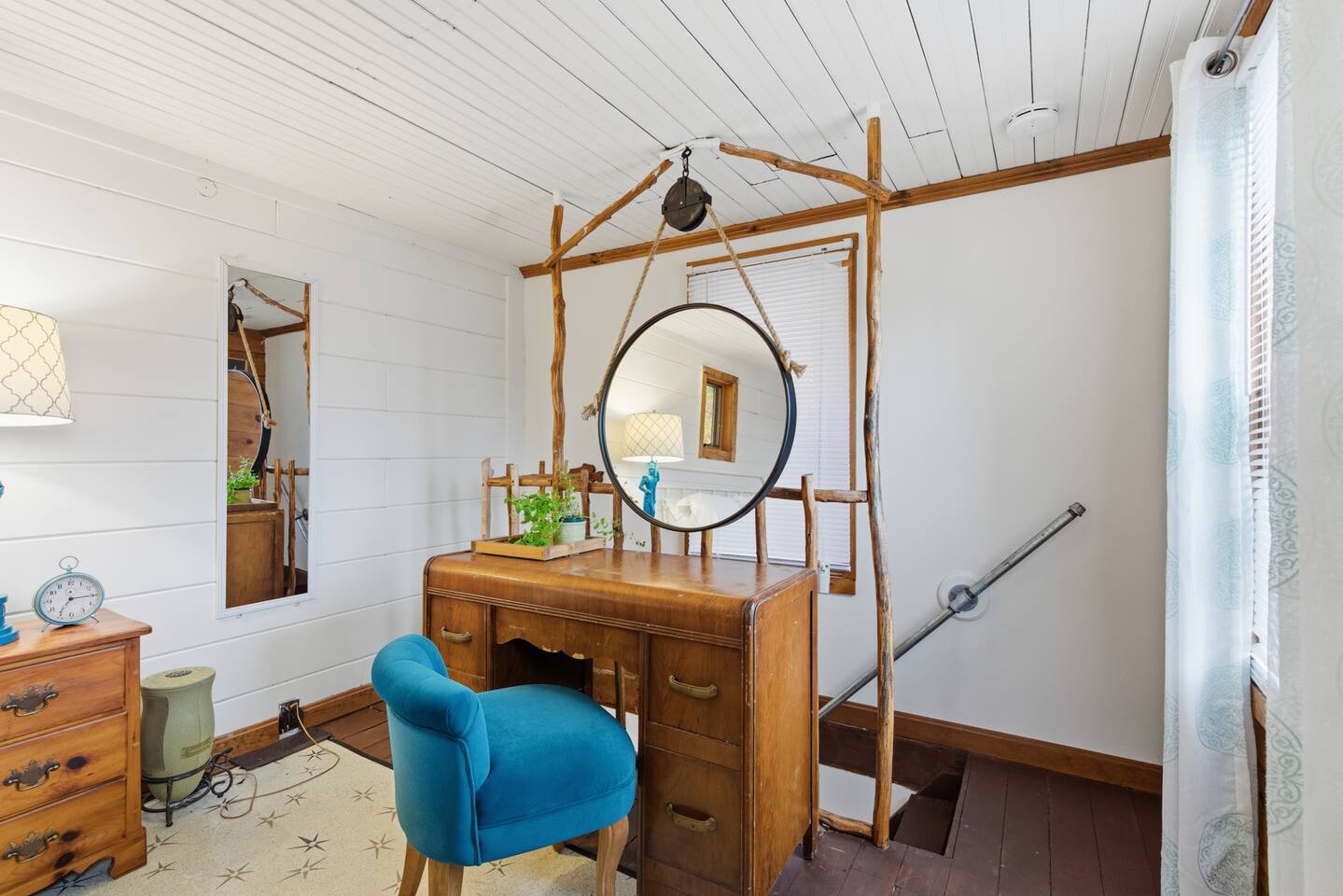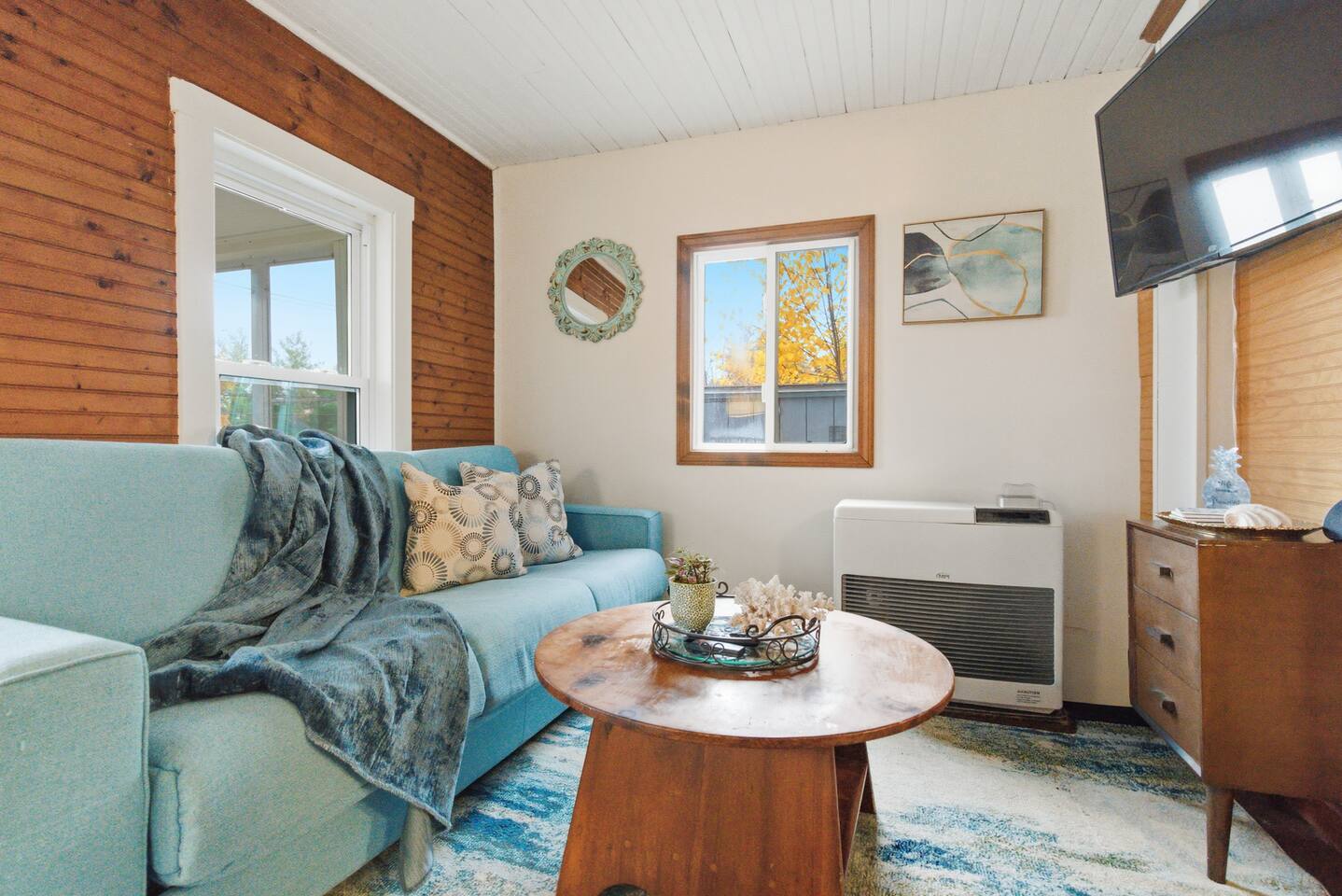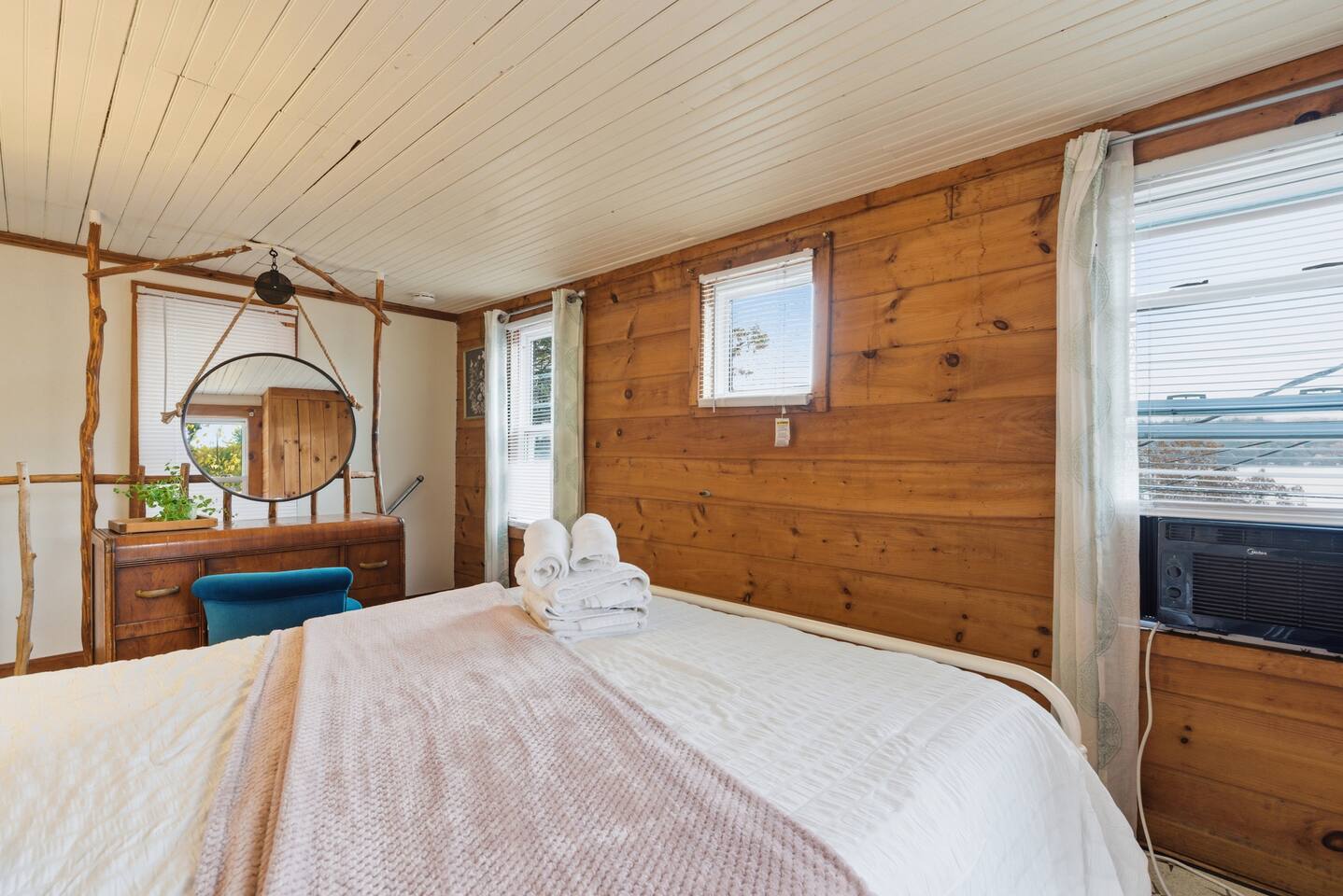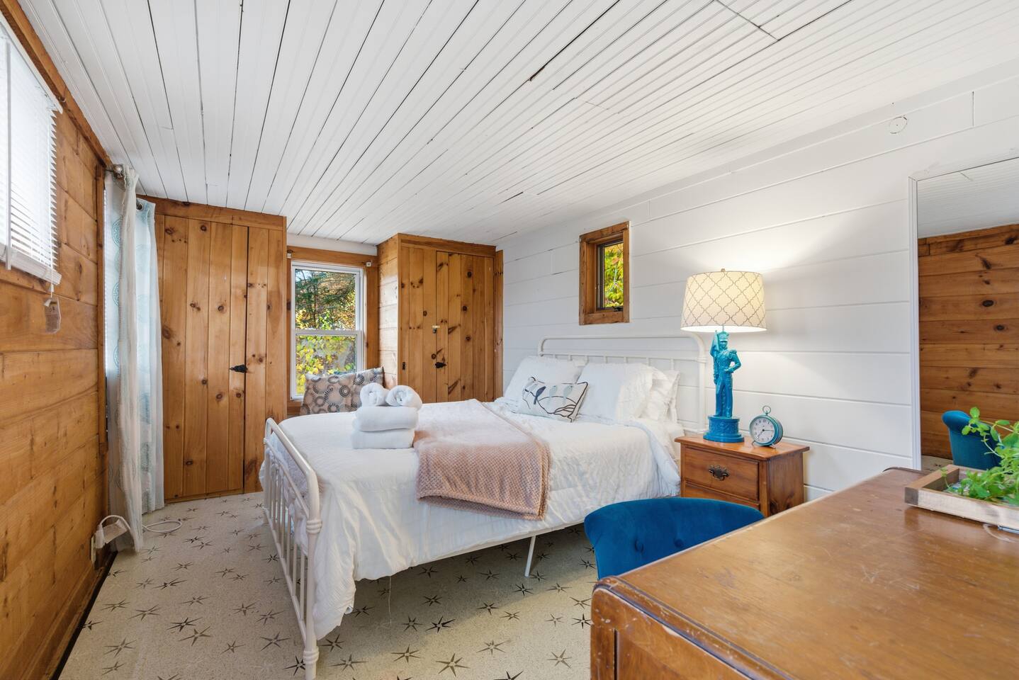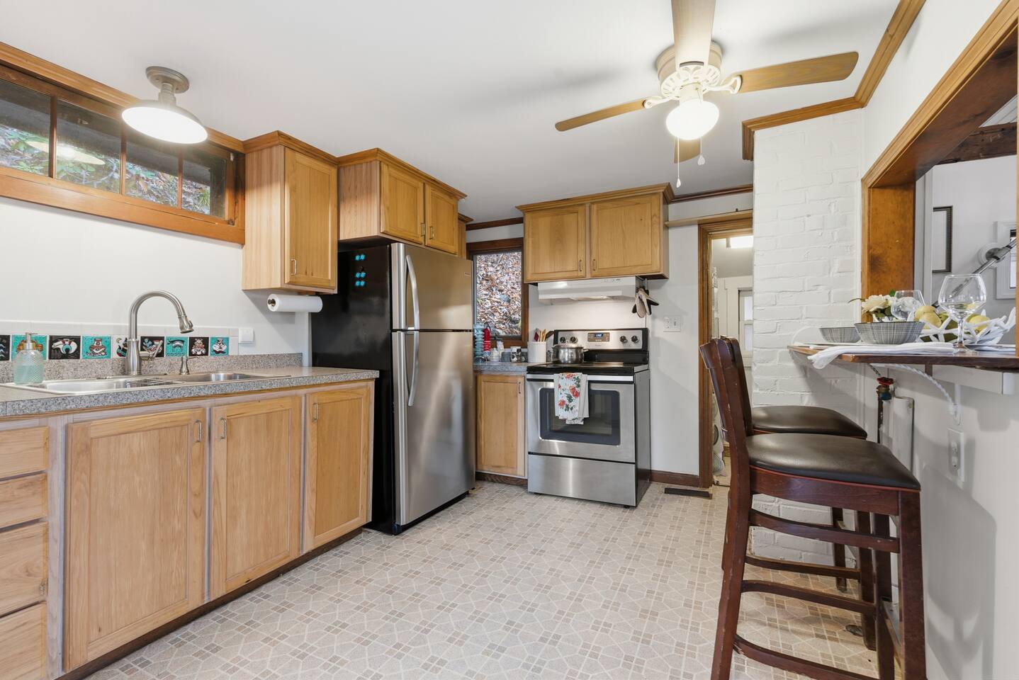 Small living room with open kitchen and breakfast bar. 1 bath with a tub/shower and no sink. The sink is in the kitchen just outside the bathroom. On the second floor is a small bedroom with queen bed. Lovely front screened porch. Bunk house with twin beds. Gas grill. Lots of stairs to climb. Not suitable for all guests.